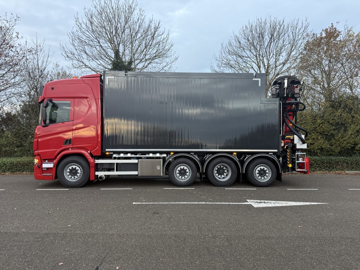 Voor Nijssen Fourages B.V. hebben wij een complete aluminium carrosserie gebouwd voor mestdistributie op een Scania R500 8×2 chassis. De opbouw is voorzien van een Epsilon autolaadkraan aan de achterzijde, waardoor het voertuig breed inzetbaar is voor transport en overslagwerkzaamheden.