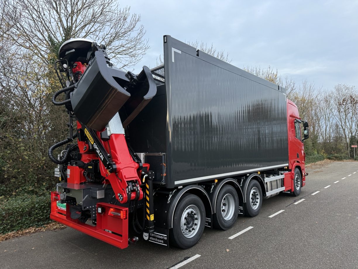 Een bijzonder detail aan deze opbouw zijn de klapnetten, die door Carrosserie Elenbaas speciaal voor dit type laadbak zijn ontwikkeld. Het scharniermechanisme en de hydraulische aandrijving zijn volledig geïntegreerd in het aluminium bovenprofiel, waardoor geen hydraulische cilinders zichtbaar zijn aan de buitenzijde van de laadbak. Dit zorgt voor een strak design, minder kans op beschadigingen en een onderhoudsvriendelijke oplossing.